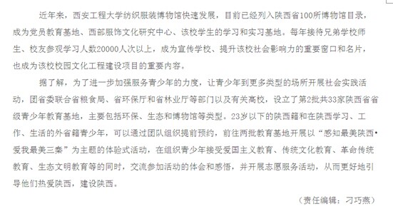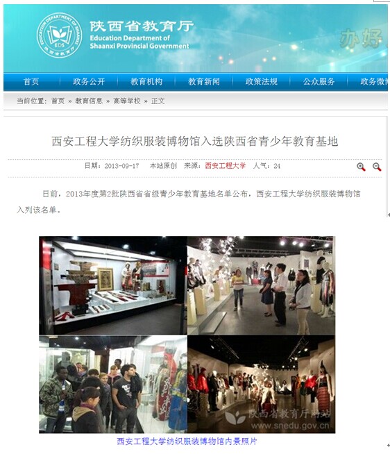 日前,我校纺织服装博物馆成为2013年度第2批陕西省省级青少年教育基地,陕西日报2013年9月1日刊登了全省2013年度第2批陕西省省级青少年教育基地名单。